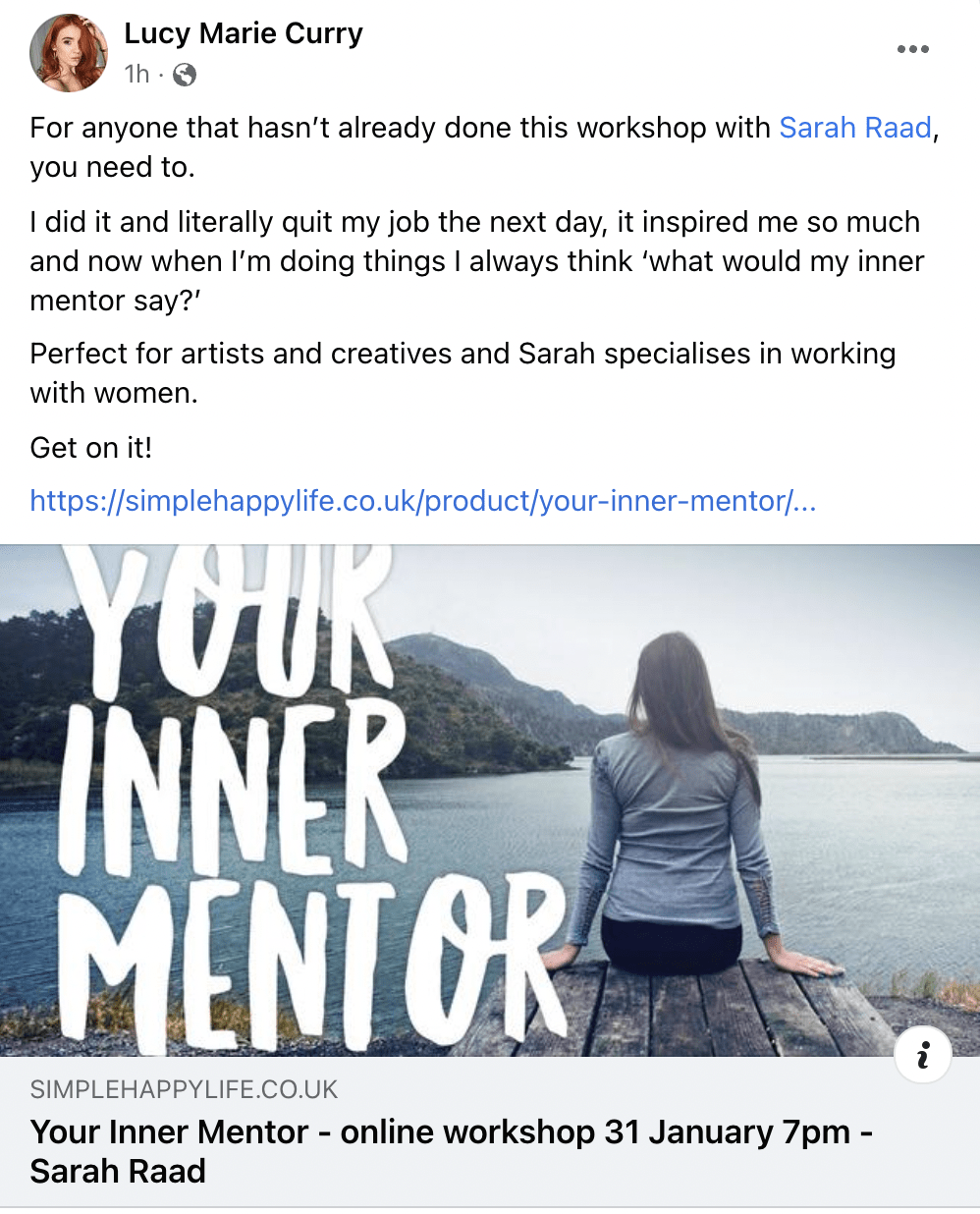 “Probably the most impactful workshop I have ever done. I made some big changes to my life after this and can pinpoint it as a real turning point for how I started to treat myself better and take my dreams seriously” – Caroline Brewster